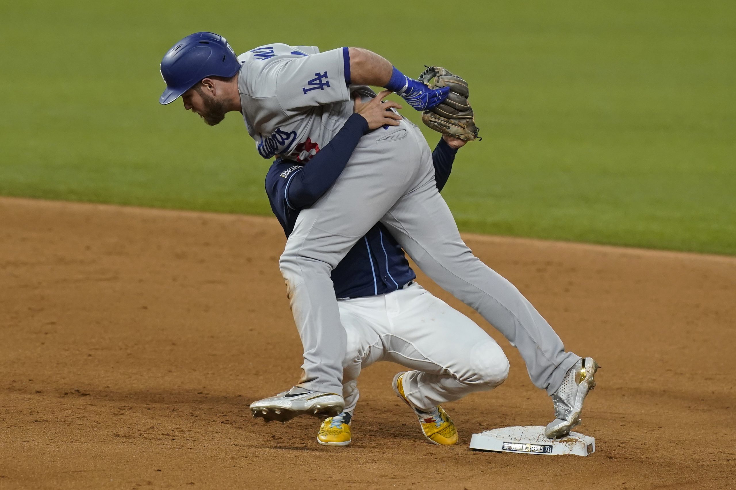 Los Angeles Dodgers’ Max Muncy is out at second after colliding with Tampa Bay Rays shortstop Willy Adames during the fifth inning in Game 4 of the baseball World Series Saturday, Oct. 24, 2020, in Arlington, Texas. (AP Photo/Eric Gay)